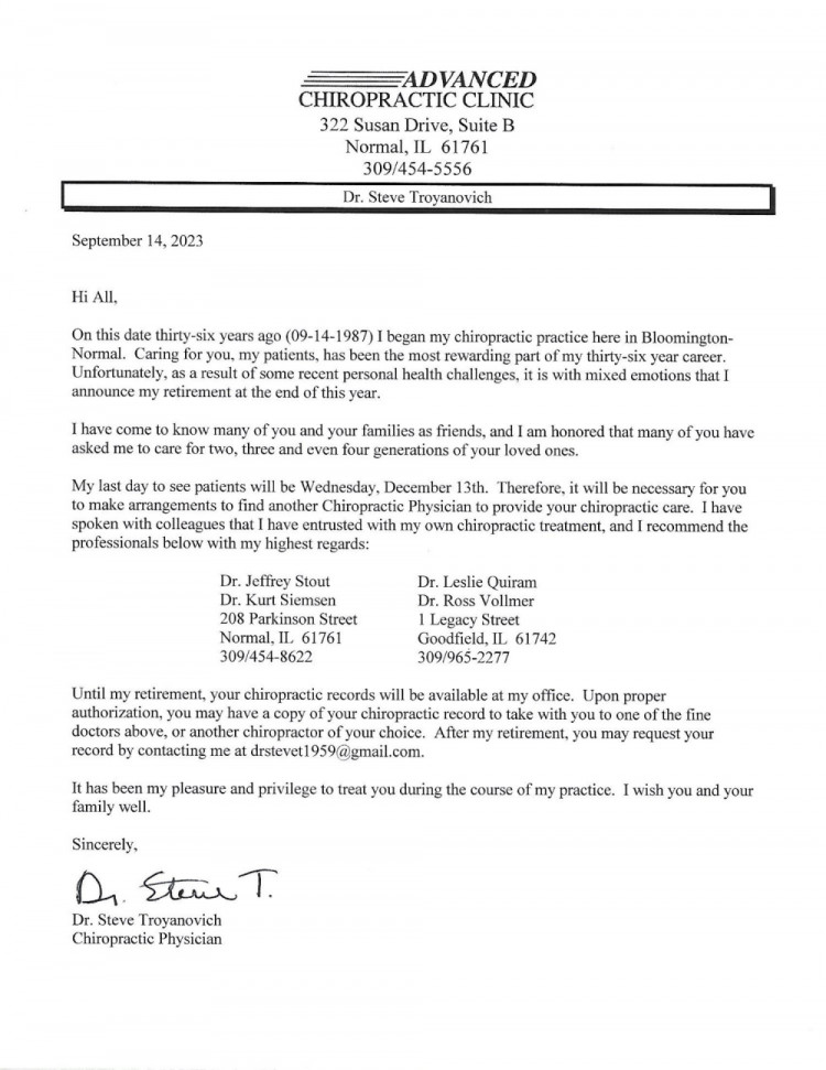 Dr. Steve Troyanovich practiced chiropractic in Bloomington-Normal, Illinois for thirty-six years, retiring in December of 2023. He has served as a director and officer for the Association for the History of Chiropractic. For six years he was the editor in chief of the journal, Chiropractic History. He has held many postgraduate faculty appointments, published over 110 articles in popular and peer- reviewed journals and served as the chairman for the Central Illinois Neuroscience Foundation’s research committee in Bloomington, Illinois.